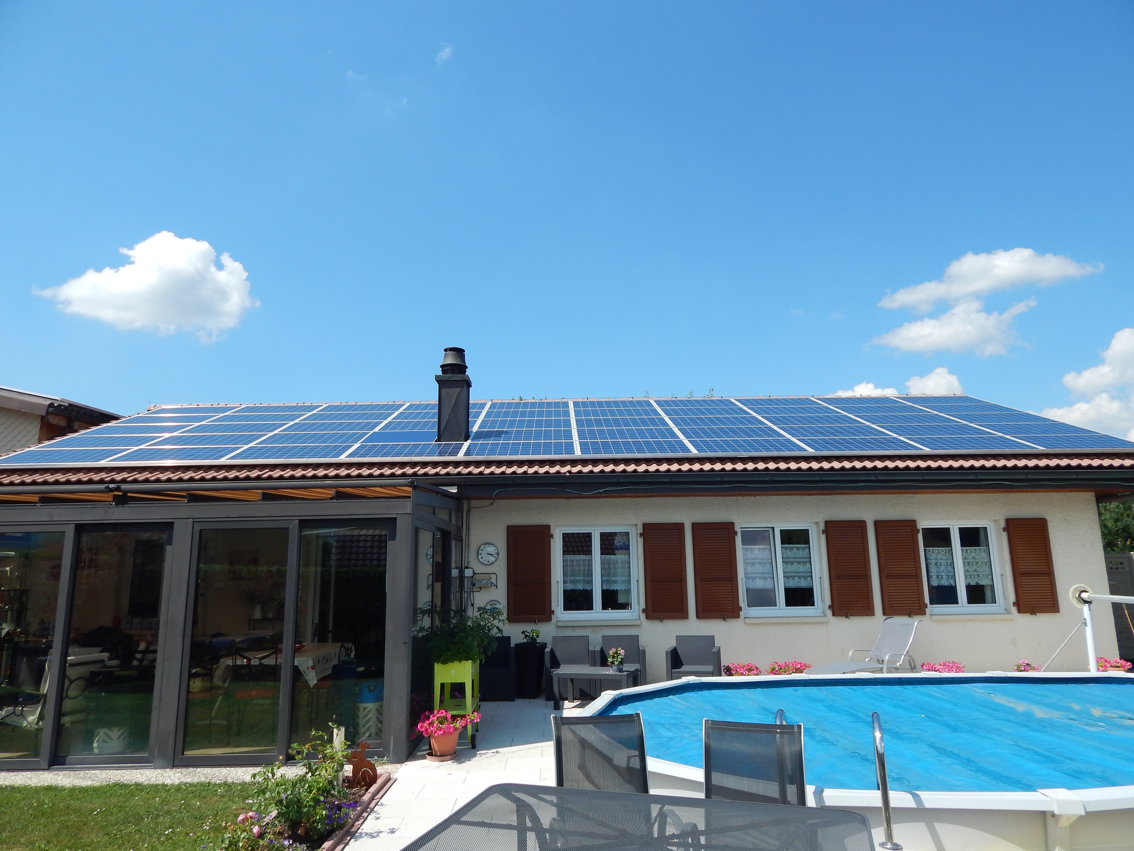 Cette installation est divisée en quatre champs PV: installation principale sur la toiture de l’habitation, installation sur la toiture du garage, sur celle du couvert et du jaccuzzi: